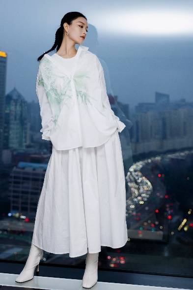 倪妮不愧是新中式领域里的时尚种草姬,她舒展大气的五官自带东方韵味,和这套纯白look相得益彰,美得轻松惬意~白色的衬衣外套宽松柔软,堆叠的褶皱塑造挺立廓形,增添不少潮范儿。衣面上虚实相间的绿叶清新淡雅,上压低调细腻的白色印花,别有中式清冷的疏离感,仿佛能让人听见白石清泉旁,竹林深处的沙沙声响,况味十足。为了丰富层次,倪妮内搭无袖背心提高露肤度,下配长款A字裙营造淑女气质,发型上更是别出新意,安排上了俏皮伶俐的多股马尾辫。夜幕降临,她脚踩高跟靴,傲立于车水马龙的都市高处,古典与未来交织,碰撞又和谐~