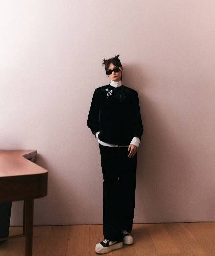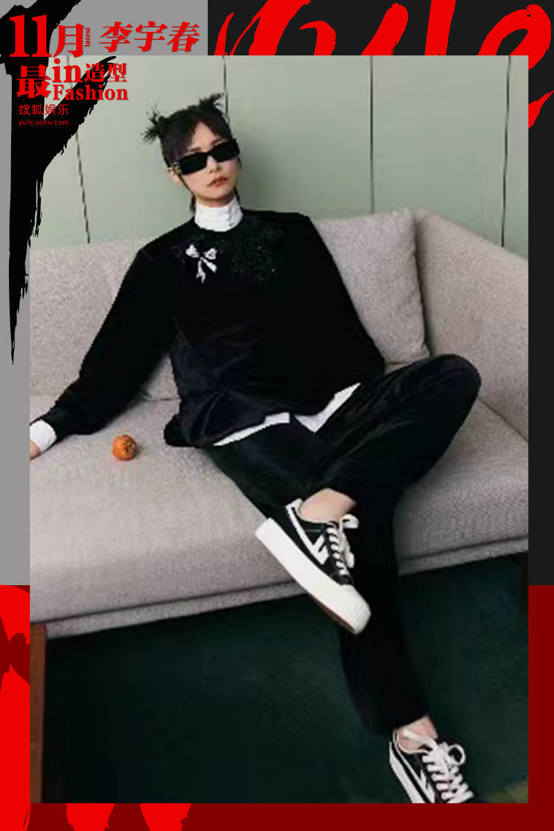 要说国风中性美,还得是李宇春~一套简单的chill感着装,黑白配又酷又拽,在一众新中式造型中可谓独树一帜!黑色的改良唐装是短丝绒质感,上绣黑色亮片,华丽低调,搭配紧口白色立领衫,层次色彩都对比强烈,一眼贵气。扎上两个自信的朝天揪,一副国潮哪吒的既视感,脚踩国产厚底板鞋,轻松将街头时尚融入进来。墨镜一戴,李宇春鬼马少女的精怪感呼之欲出。尤其是胸前那枚定制的蝴蝶结盘扣,不仅注入了俏皮的气质,更如绅士袋口里的小方巾,点亮了整体造型。