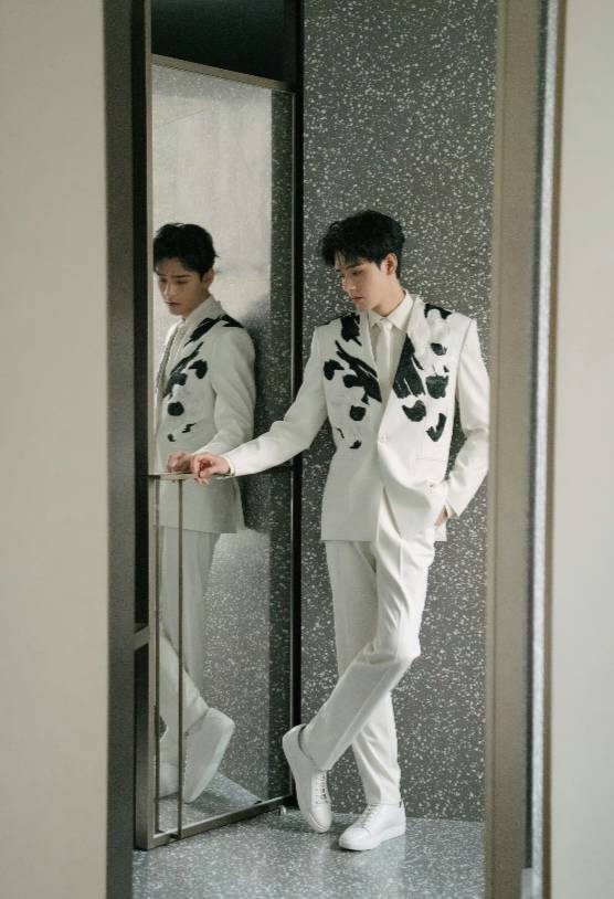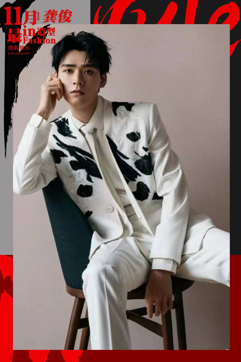 以中式西装惊艳过众人的龚俊,这次依旧营业成功!他身穿白色西服套装,虽然样式是全西式的,但承载的纹饰却大有文章,直接非遗国粹起步。蜀锦织成的熊猫栩栩如生,丝线光泽闪烁,真实如毛发。而重新结构后的图案,不仅摩登时尚,恣意大气,更有了山水写意的潇洒。墨点甩落在白净的西装上,气势磅礴。无论是材质的碰撞,还是风格色彩的对立,这独特的视觉冲击力都让人过目难忘。