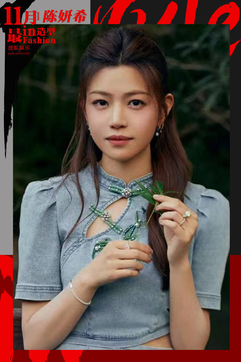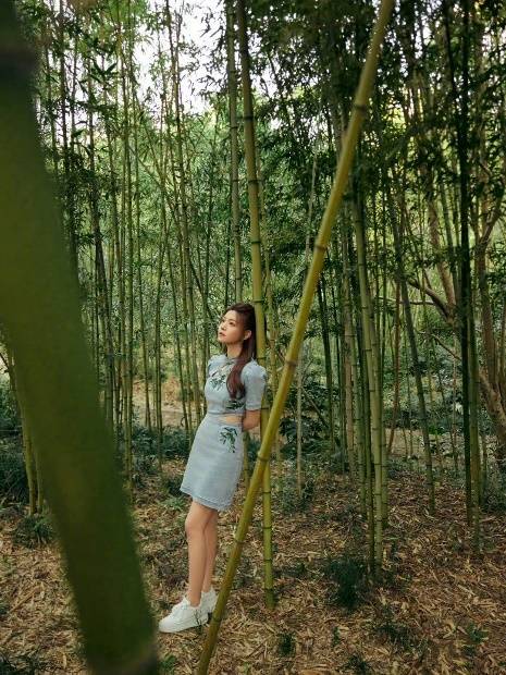 同样是牛仔新中式两种风格的碰撞,陈妍希置身江南竹林,演绎出不同于白鹿的风情。淡蓝色牛仔短裙活泼减龄又显白,采用旗袍样式,清新淡雅,直襟的设计非常修身,与单侧腰部做柳叶形的挖空处理,平衡上半身露肤度,清凉又吸睛。泡泡袖的加入,营造出甜美的气息,混搭出一种破次元的感觉。纵观全身,陈妍希最大的亮点就是对“竹”的应用。盘扣的设计独具匠心,以多颗穿珠做成竹子样式,晶莹剔透,在白嫩肌肤的衬托下格外有色泽。竹叶的刺绣也点缀在周身,每一片都仿佛在轻舞飞扬,充满自然的韵味,亦静亦动。